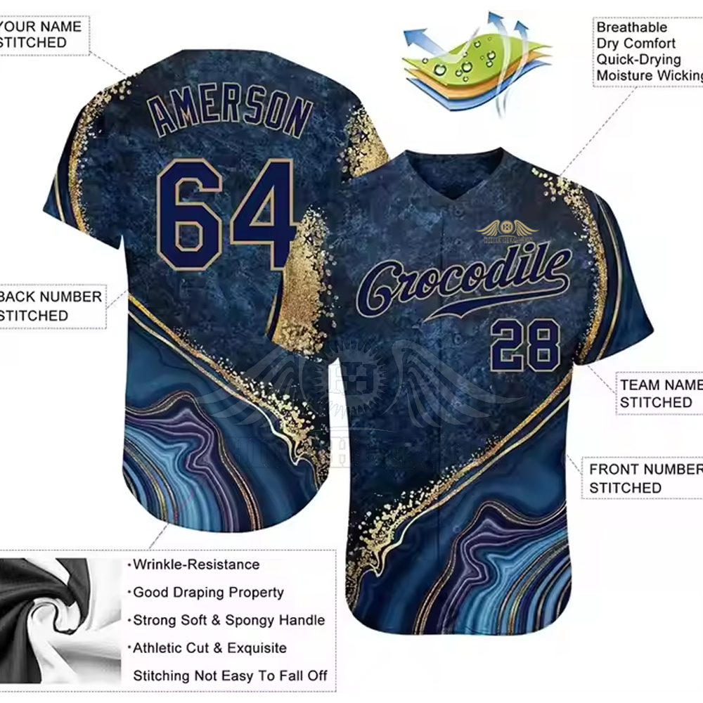 A baseball jersey is a button-up shirt made from breathable, moisture-wicking fabric, designed for comfort and performance. It typically features the team name or logo on the front and player name and number on the back.